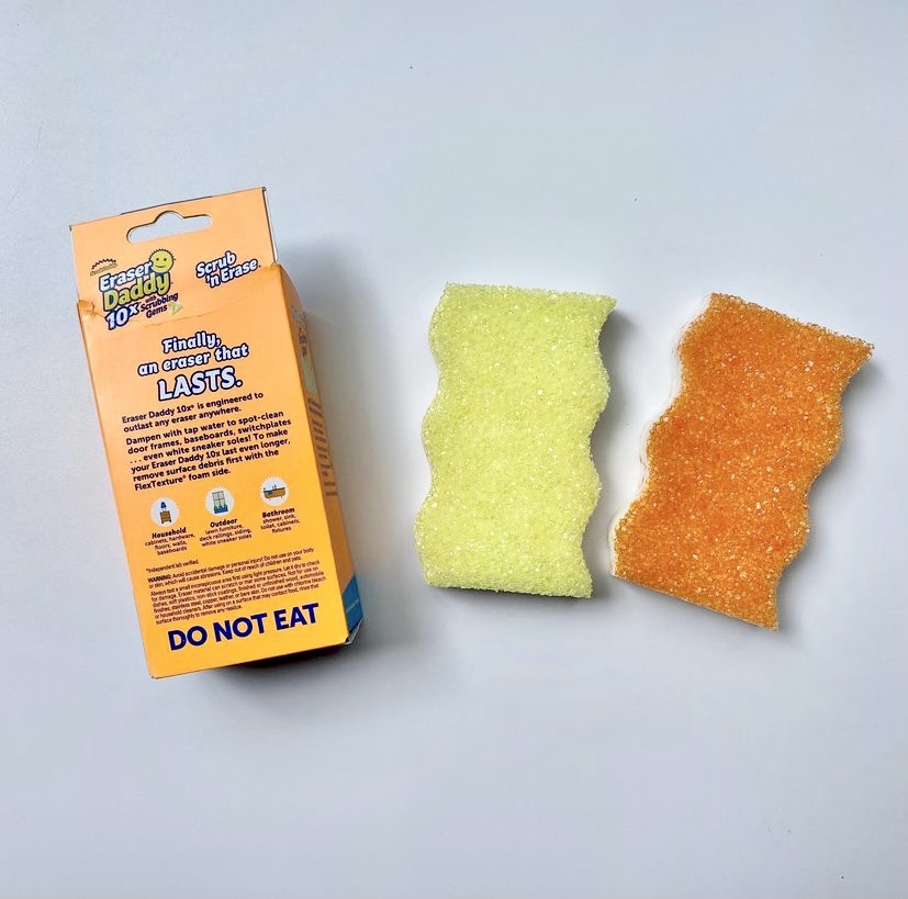 Eraser Daddy 10x. Eraser Daddy is a durable melamine eraser with scrubbing gems for a more powerful clean. 10x can remove crayon, pencil, and other scuff marks from walls and surfaces. It is also a powerful tool in erasing scum, dirt, and stains in the bathroom.